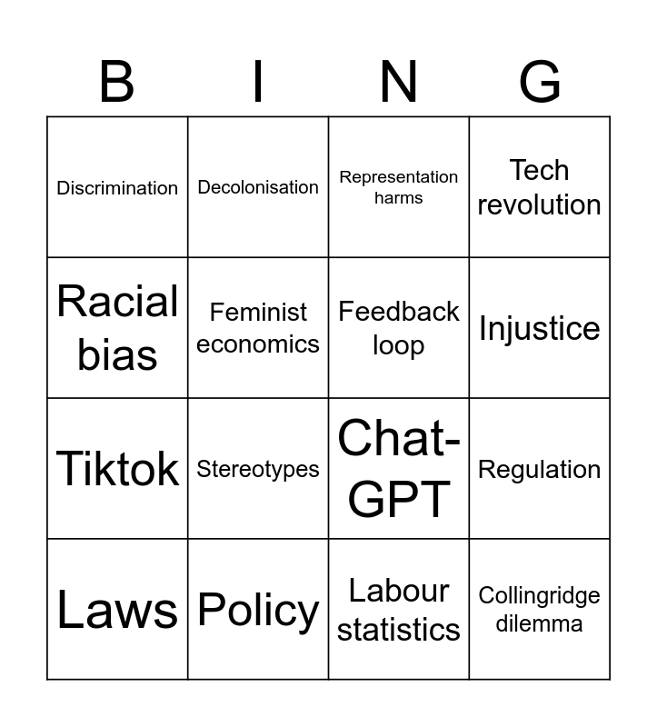 This bingo card has 24 words: Free!, Inequality, Injustice, Gender bias, Racial bias, Discrimination, Feminist economics, Decolonisation, Policy, Barbie, Tiktok, Chat-GPT, White-collar worker, Dataset, Feedback loop, Generative AI, Labour statistics, Representation harms, Stereotypes, Regulation, Laws, Collingridge dilemma, Tech revolution and The OECD.