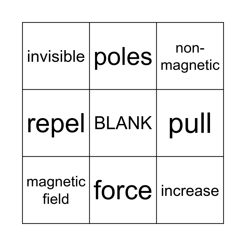 This bingo card has a free space and 11 words: attract, force, increase, magnetic field, poles, non-magnetic, pull, push, repel, invisible and iron.