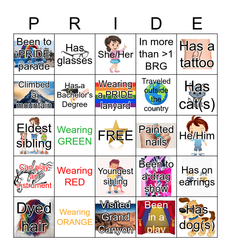 This bingo card has 20 images, a free space and 24 words: Wearing RED, Wearing ORANGE, Wearing a PRIDE lanyard, Dyed hair, Has a tattoo, Been to PRIDE parade, Climbed a mountain, Has glasses, Painted nails, Youngest sibling, Traveled outside the country, Eldest sibling, Been to a drag show, Has on earrings, Has a Bachelor's Degree, Been in a play, He/Him, She/Her, Has cat(s), Wearing GREEN, Has dog(s), Can play an instrument, In more than >1 BRG and Visited Grand Canyon.