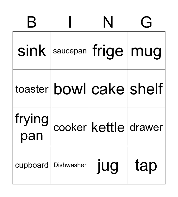 This bingo card has 16 words: Dishwasher, drawer, frige, sink, frying pan, saucepan, kettle, jug, toaster, bowl, cupboard, mug, cooker, shelf, cake and tap.