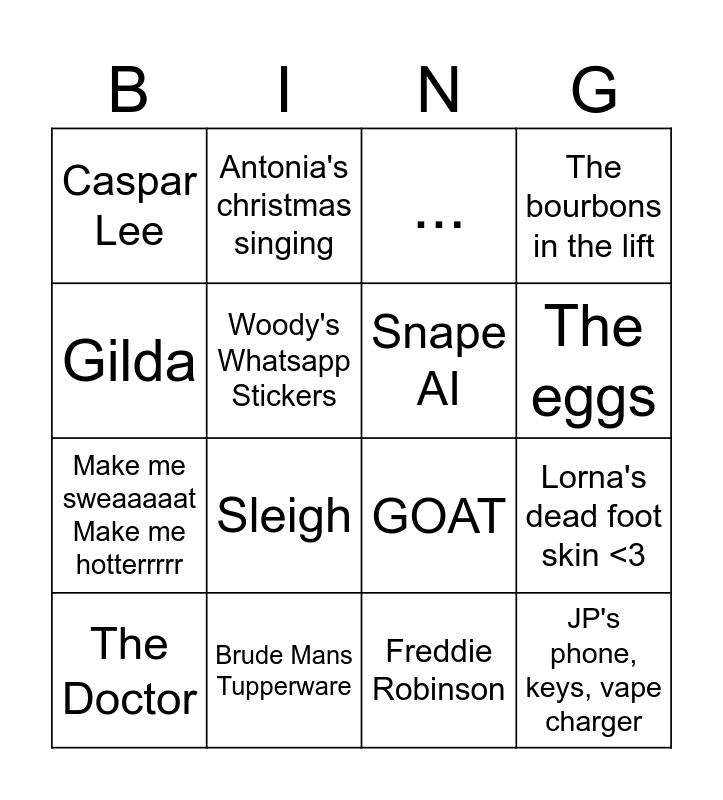 This bingo card has 20 words: Lorna's dead foot skin <3, Bruni, ..., Margaux's Mason Jar, The Doctor, Gilda, Brude Mans Tupperware, Caspar Lee, Make me sweaaaaat Make me hotterrrrr, Antonia's christmas singing, Sleigh, GOAT, Woody's Whatsapp Stickers, JP's phone, keys, vape charger, Snape AI, I can't think of anything funny at the moment, The eggs, The bourbons in the lift, Freddie Robinson and Zara's long email.