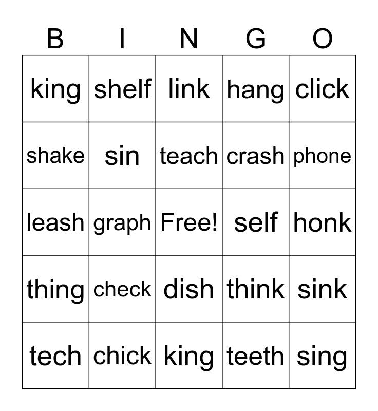 This bingo card has a free space and 24 words: check, chick, teach, tech, click, king, shake, shelf, self, dish, crash, leash, think, sink, sin, teeth, honk, link, phone, graph, sing, thing, hang and king.