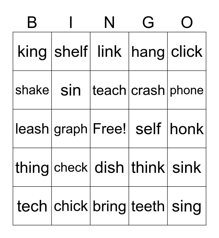 This bingo card has a free space and 24 words: check, chick, teach, tech, click, king, shake, shelf, self, dish, crash, leash, think, sink, sin, teeth, honk, link, phone, graph, sing, thing, hang and bring.