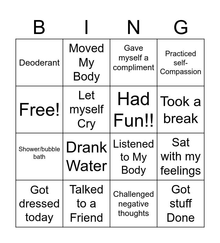 This bingo card has 16 words: Talked to a Friend, Sat with my feelings, Gave myself a compliment, Deoderant, Shower/bubble bath, Moved My Body, Listened to My Body, Challenged negative thoughts, Free!, Let myself Cry, Got dressed today, Practiced self-Compassion, Drank Water, Took a break, Had Fun!! and Got stuff Done.