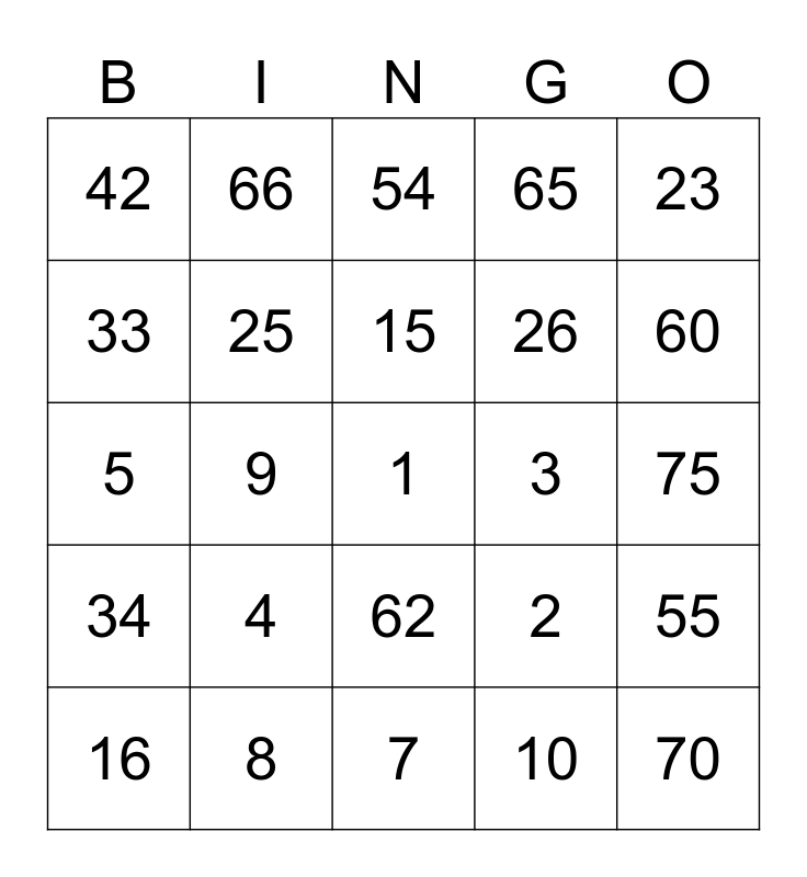 This bingo card has a free space and 24 words: 4, 8, 15, 16, 23, 42, 33, 66, 3, 62, 26, 5, 2, 55, 25, 10, 75, 54, 60, 9, 70, 34, 65 and 7.