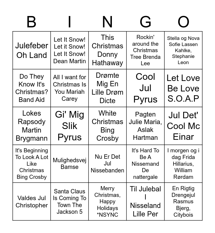 This bingo card has 45 words: Free!, White Christmas Bing Crosby, What Christmas Means To Me Stevie Wonder, Valdes Jul Christopher, Tinka Burhan G, Frida Brygmann, Til Julebal I Nisseland Lille Per, This Christmas Donny Hathaway, Thank God It's Christmas Queen, Stella og Nova Sofie Lassen Kahlke, Stephanie Leon, Santa Claus Is Coming To Town The Jackson 5, Rockin' around the Christmas Tree Brenda Lee, Pagten Julie Maria, Aslak Hartman, Nu Er Det Jul Nissebanden, Mulighedsvej Bamse, Mistletoe Justin Bieber, Merry Christmas, Happy Holidays *NSYNC, Merry Christmas Everyone Shakin'Stevens, Lokes Rapsody Martin Brygmann, Lille Messias Anne Linnet, Let Love Be Love S.O.A.P, Let It Snow! Let it Snow! Let It Snow! Dean Martin, Last Christmas Wham, Koldt Udenfor Page Four, Julefeber Oh Land, Jul i Angora - Drengene Angora, Jul Det' Cool Mc Einar, Jingle Bell Rock Bobby Helms, Jesus Og Josefine Julie, Martin Brygmann, It's Hard To Be A Nissemand De nattergale, It's Beginning To Look A Lot Like Christmas Bing Crosby, I Saw Mommy Kissing Santa Claus The Jackson 5, I morgen og i dag Frida Hillarius, William Rørdam, Have Yourself a Mery Little Christmas Judy Garland, Happy Xmas (War Is Over) John Lennon, Yoko Ono, Guld Jul Gulddreng, Gi' Mig Slik Pyrus, Flødebolleræs Cast of 'Brødrene Mortensens Jul', Feliz Navidad Jose Feliciano, En Rigtig Drengejul Rasmus Bjerg, Citybois, Drømte Mig En Lille Drøm Dicte, Do They Know It's Christmas? Band Aid, Cool Jul Pyrus, Christmas In Hollis Run-D.M.C, All I want for Christmas Is You Mariah Carey and 8 Days Of Christmas Destiny's Child.