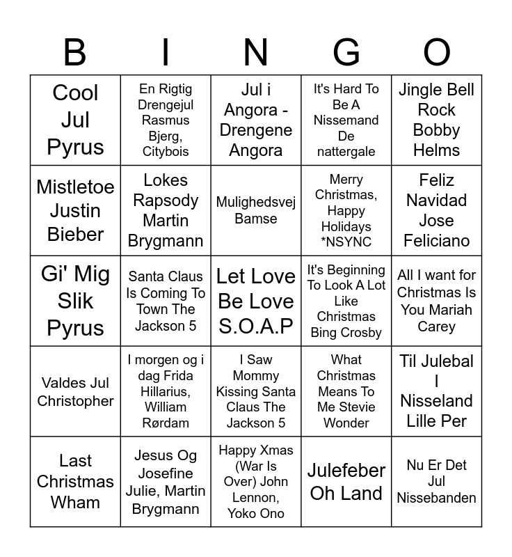 This bingo card has 45 words: Free!, Let Love Be Love S.O.A.P, Let It Snow! Let it Snow! Let It Snow! Dean Martin, Last Christmas Wham, Koldt Udenfor Page Four, Julefeber Oh Land, Jul i Angora - Drengene Angora, Jul Det' Cool Mc Einar, Jingle Bell Rock Bobby Helms, Jesus Og Josefine Julie, Martin Brygmann, It's Hard To Be A Nissemand De nattergale, It's Beginning To Look A Lot Like Christmas Bing Crosby, I Saw Mommy Kissing Santa Claus The Jackson 5, I morgen og i dag Frida Hillarius, William Rørdam, Have Yourself a Mery Little Christmas Judy Garland, Happy Xmas (War Is Over) John Lennon, Yoko Ono, Guld Jul Gulddreng, Gi' Mig Slik Pyrus, Flødebolleræs Cast of 'Brødrene Mortensens Jul', Feliz Navidad Jose Feliciano, En Rigtig Drengejul Rasmus Bjerg, Citybois, Drømte Mig En Lille Drøm Dicte, Do They Know It's Christmas? Band Aid, Cool Jul Pyrus, Christmas In Hollis Run-D.M.C, All I want for Christmas Is You Mariah Carey, 8 Days Of Christmas Destiny's Child, White Christmas Bing Crosby, What Christmas Means To Me Stevie Wonder, Valdes Jul Christopher, Tinka Burhan G, Frida Brygmann, Til Julebal I Nisseland Lille Per, This Christmas Donny Hathaway, Thank God It's Christmas Queen, Stella og Nova Sofie Lassen Kahlke, Stephanie Leon, Santa Claus Is Coming To Town The Jackson 5, Rockin' around the Christmas Tree Brenda Lee, Pagten Julie Maria, Aslak Hartman, Nu Er Det Jul Nissebanden, Mulighedsvej Bamse, Mistletoe Justin Bieber, Merry Christmas, Happy Holidays *NSYNC, Merry Christmas Everyone Shakin'Stevens, Lokes Rapsody Martin Brygmann and Lille Messias Anne Linnet.