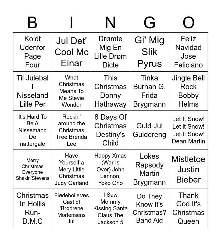 This bingo card has 45 words: Free!, 8 Days Of Christmas Destiny's Child, All I want for Christmas Is You Mariah Carey, Christmas In Hollis Run-D.M.C, Cool Jul Pyrus, Do They Know It's Christmas? Band Aid, Drømte Mig En Lille Drøm Dicte, En Rigtig Drengejul Rasmus Bjerg, Citybois, Feliz Navidad Jose Feliciano, Flødebolleræs Cast of 'Brødrene Mortensens Jul', Gi' Mig Slik Pyrus, Guld Jul Gulddreng, Happy Xmas (War Is Over) John Lennon, Yoko Ono, Have Yourself a Mery Little Christmas Judy Garland, I morgen og i dag Frida Hillarius, William Rørdam, I Saw Mommy Kissing Santa Claus The Jackson 5, It's Beginning To Look A Lot Like Christmas Bing Crosby, It's Hard To Be A Nissemand De nattergale, Jesus Og Josefine Julie, Martin Brygmann, Jingle Bell Rock Bobby Helms, Jul Det' Cool Mc Einar, Jul i Angora Drengene fra Angora, Julefeber Oh Land, Koldt Udenfor Page Four, Last Christmas Wham, Let It Snow! Let it Snow! Let It Snow! Dean Martin, Let Love Be Love S.O.A.P, Lille Messias Anne Linnet, Lokes Rapsody Martin Brygmann, Merry Christmas Everyone Shakin'Stevens, Merry Christmas, Happy Holidays *NSYNC, Mistletoe Justin Bieber, Mulighedsvej Bamse, Nu Er Det Jul Nissebanden, Pagten Julie Maria, Aslak Hartman, Rockin' around the Christmas Tree Brenda Lee, Santa Claus Is Coming To Town The Jackson 5, Stella og Nova Sofie Lassen Kahlke, Stephanie Leon, Thank God It's Christmas Queen, This Christmas Donny Hathaway, Til Julebal I Nisseland Lille Per, Tinka Burhan G, Frida Brygmann, Valdes Jul Christopher, What Christmas Means To Me Stevie Wonder and White Christmas Bing Crosby.