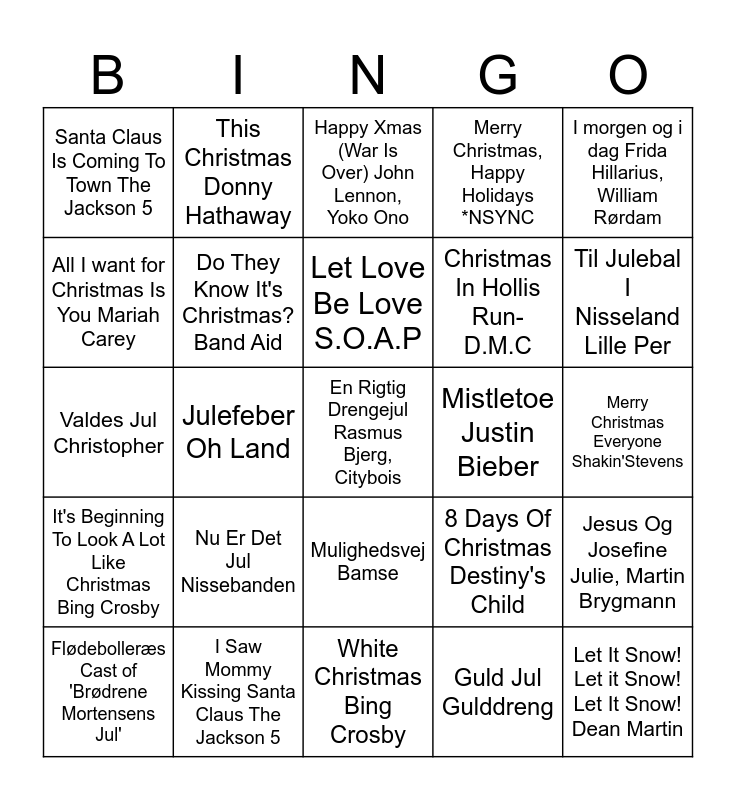 This bingo card has 45 words: Free!, En Rigtig Drengejul Rasmus Bjerg, Citybois, Feliz Navidad Jose Feliciano, Flødebolleræs Cast of 'Brødrene Mortensens Jul', Gi' Mig Slik Pyrus, Guld Jul Gulddreng, Happy Xmas (War Is Over) John Lennon, Yoko Ono, Have Yourself a Mery Little Christmas Judy Garland, I morgen og i dag Frida Hillarius, William Rørdam, I Saw Mommy Kissing Santa Claus The Jackson 5, Merry Christmas, Happy Holidays *NSYNC, Mistletoe Justin Bieber, Mulighedsvej Bamse, Nu Er Det Jul Nissebanden, Pagten Julie Maria, Aslak Hartman, White Christmas Bing Crosby, What Christmas Means To Me Stevie Wonder, Valdes Jul Christopher, Tinka Burhan G, Frida Brygmann, Til Julebal I Nisseland Lille Per, This Christmas Donny Hathaway, Thank God It's Christmas Queen, Stella og Nova Sofie Lassen Kahlke, Stephanie Leon, Santa Claus Is Coming To Town The Jackson 5, Rockin' around the Christmas Tree Brenda Lee, Merry Christmas Everyone Shakin'Stevens, Lokes Rapsody Martin Brygmann, Lille Messias Anne Linnet, 8 Days Of Christmas Destiny's Child, It's Beginning To Look A Lot Like Christmas Bing Crosby, It's Hard To Be A Nissemand De nattergale, Jesus Og Josefine Julie, Martin Brygmann, Jingle Bell Rock Bobby Helms, Jul Det' Cool Mc Einar, Jul i Angora - Drengene Angora, Julefeber Oh Land, Koldt Udenfor Page Four, Last Christmas Wham, Let It Snow! Let it Snow! Let It Snow! Dean Martin, Let Love Be Love S.O.A.P, All I want for Christmas Is You Mariah Carey, Christmas In Hollis Run-D.M.C, Cool Jul Pyrus, Do They Know It's Christmas? Band Aid and Drømte Mig En Lille Drøm Dicte.