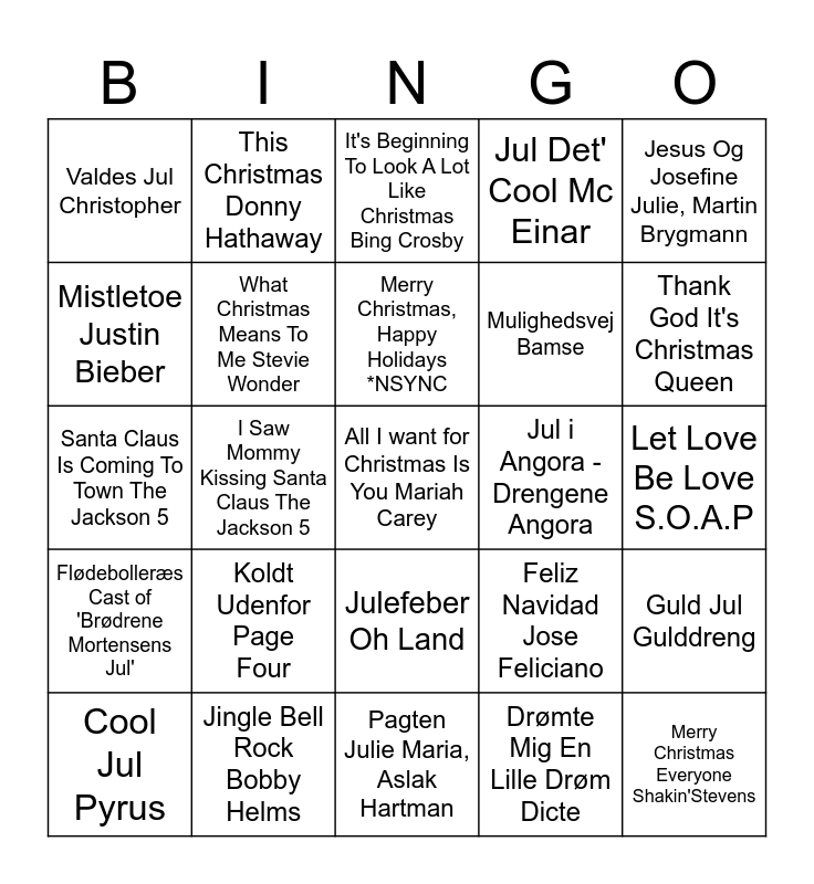 This bingo card has 45 words: Free!, All I want for Christmas Is You Mariah Carey, Christmas In Hollis Run-D.M.C, Cool Jul Pyrus, Do They Know It's Christmas? Band Aid, Drømte Mig En Lille Drøm Dicte, It's Beginning To Look A Lot Like Christmas Bing Crosby, It's Hard To Be A Nissemand De nattergale, Jesus Og Josefine Julie, Martin Brygmann, Jingle Bell Rock Bobby Helms, Jul Det' Cool Mc Einar, Jul i Angora - Drengene Angora, Julefeber Oh Land, Koldt Udenfor Page Four, Last Christmas Wham, Pagten Julie Maria, Aslak Hartman, Rockin' around the Christmas Tree Brenda Lee, Santa Claus Is Coming To Town The Jackson 5, Stella og Nova Sofie Lassen Kahlke, Stephanie Leon, Thank God It's Christmas Queen, This Christmas Donny Hathaway, Til Julebal I Nisseland Lille Per, Tinka Burhan G, Frida Brygmann, Valdes Jul Christopher, Let It Snow! Let it Snow! Let It Snow! Dean Martin, Let Love Be Love S.O.A.P, 8 Days Of Christmas Destiny's Child, En Rigtig Drengejul Rasmus Bjerg, Citybois, Feliz Navidad Jose Feliciano, Flødebolleræs Cast of 'Brødrene Mortensens Jul', Gi' Mig Slik Pyrus, Guld Jul Gulddreng, Happy Xmas (War Is Over) John Lennon, Yoko Ono, Have Yourself a Mery Little Christmas Judy Garland, I morgen og i dag Frida Hillarius, William Rørdam, I Saw Mommy Kissing Santa Claus The Jackson 5, Lille Messias Anne Linnet, Lokes Rapsody Martin Brygmann, Merry Christmas Everyone Shakin'Stevens, Merry Christmas, Happy Holidays *NSYNC, Mistletoe Justin Bieber, Mulighedsvej Bamse, Nu Er Det Jul Nissebanden, What Christmas Means To Me Stevie Wonder and White Christmas Bing Crosby.