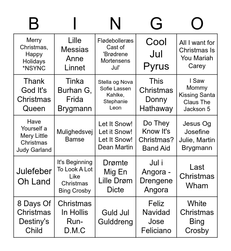This bingo card has 45 words: Free!, Let It Snow! Let it Snow! Let It Snow! Dean Martin, Let Love Be Love S.O.A.P, 8 Days Of Christmas Destiny's Child, En Rigtig Drengejul Rasmus Bjerg, Citybois, Feliz Navidad Jose Feliciano, Flødebolleræs Cast of 'Brødrene Mortensens Jul', Gi' Mig Slik Pyrus, All I want for Christmas Is You Mariah Carey, Christmas In Hollis Run-D.M.C, Cool Jul Pyrus, Do They Know It's Christmas? Band Aid, Drømte Mig En Lille Drøm Dicte, It's Beginning To Look A Lot Like Christmas Bing Crosby, It's Hard To Be A Nissemand De nattergale, Guld Jul Gulddreng, Happy Xmas (War Is Over) John Lennon, Yoko Ono, Have Yourself a Mery Little Christmas Judy Garland, I morgen og i dag Frida Hillarius, William Rørdam, I Saw Mommy Kissing Santa Claus The Jackson 5, Lille Messias Anne Linnet, Lokes Rapsody Martin Brygmann, Merry Christmas Everyone Shakin'Stevens, Merry Christmas, Happy Holidays *NSYNC, Mistletoe Justin Bieber, Jesus Og Josefine Julie, Martin Brygmann, Jingle Bell Rock Bobby Helms, Jul Det' Cool Mc Einar, Jul i Angora - Drengene Angora, Julefeber Oh Land, Koldt Udenfor Page Four, Last Christmas Wham, Pagten Julie Maria, Aslak Hartman, Rockin' around the Christmas Tree Brenda Lee, Santa Claus Is Coming To Town The Jackson 5, Mulighedsvej Bamse, Nu Er Det Jul Nissebanden, What Christmas Means To Me Stevie Wonder, White Christmas Bing Crosby, Stella og Nova Sofie Lassen Kahlke, Stephanie Leon, Thank God It's Christmas Queen, This Christmas Donny Hathaway, Til Julebal I Nisseland Lille Per, Tinka Burhan G, Frida Brygmann and Valdes Jul Christopher.