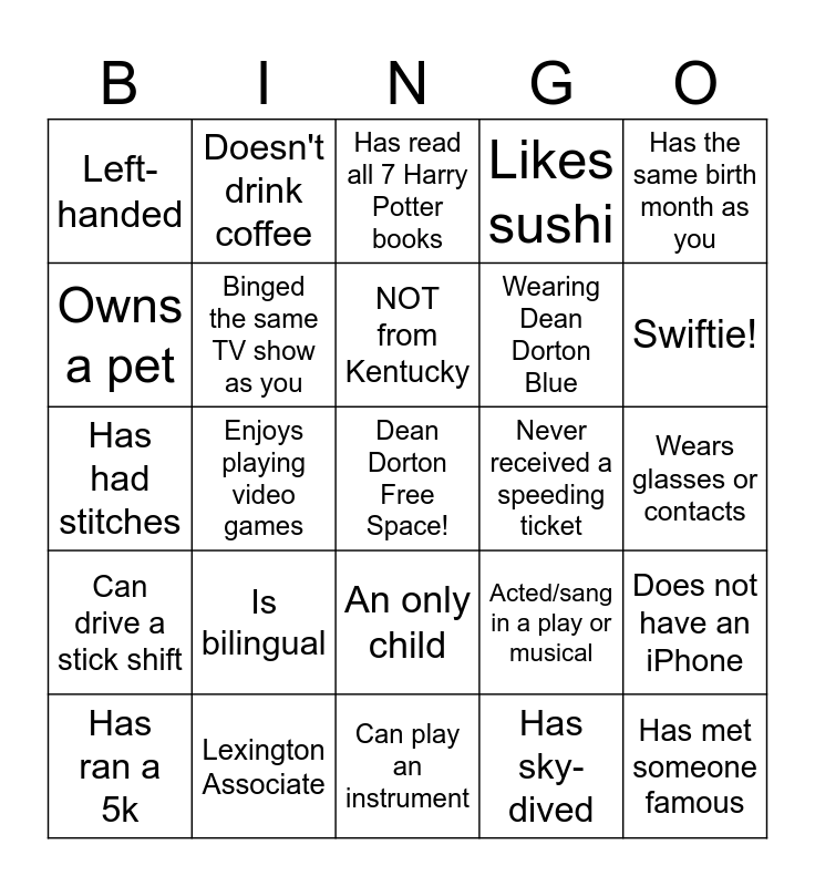 This bingo card has a free space and 24 words: Is bilingual, Lexington Associate, NOT from Kentucky, Has ran a 5k, Has the same birth month as you, Left-handed, Owns a pet, Doesn't drink coffee, Never received a speeding ticket, An only child, Wearing Dean Dorton Blue, Has had stitches, Acted/sang in a play or musical, Does not have an iPhone, Binged the same TV show as you, Has sky-dived, Wears glasses or contacts, Has read all 7 Harry Potter books, Swiftie!, Enjoys playing video games, Has met someone famous, Can drive a stick shift, Likes sushi and Can play an instrument.