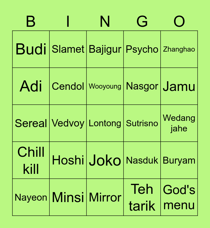 This bingo card has a free space and 24 words: Hoshi, Minsi, Wooyoung, Nayeon, Zhanghao, Budi, Adi, Slamet, Sutrisno, Joko, Nasgor, Sereal, Nasduk, Buryam, Cendol, Teh tarik, Wedang jahe, Bajigur, Jamu, Vedvoy, God's menu, Chill kill, Psycho and Mirror.