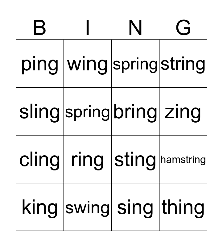 This bingo card has a free space and 15 words: king, thing, spring, ping, zing, sling, ring, sing, spring, cling, hamstring, string, bring, wing and swing.
