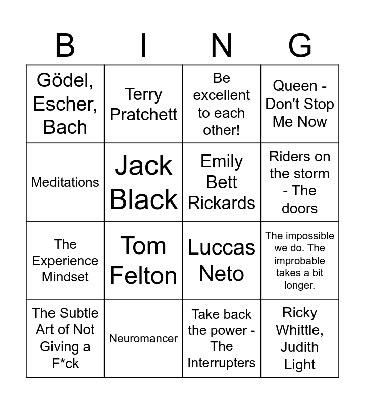 This bingo card has 20 words: The impossible we do. The improbable takes a bit longer., More flies are caught with honey than with vinegar, Be excellent to each other!, It is what it is, let's see., The Subtle Art of Not Giving a F*ck, Meditations, Neuromancer, Gödel, Escher, Bach, The Experience Mindset, Terry Pratchett, Tom Felton, Luccas Neto, Jack Black, Ricky Whittle, Judith Light, Emily Bett Rickards, Songs the Night Sings - The Dark Element, Riders on the storm - The doors, Queen - Don't Stop Me Now, Take back the power - The Interrupters and Coolio - Gangsta’s Paradise.