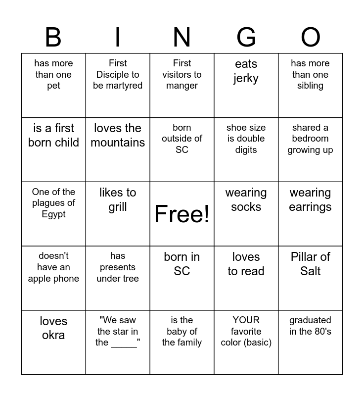 This bingo card has a free space and 39 words: Short hair, has a beard, loves the beach, loves the mountains, loves okra, born in SC, born outside of SC, wakes up for work before 5am, has more than one sibling, doesn't have an apple phone, likes to grill, eats jerky, graduated in the 80's, wearing earrings, wearing socks, has presents under tree, loves plants, has more than one pet, can drive a stick shift, loves to read, is a first born child, is the baby of the family, shoe size is double digits, shared a bedroom growing up, First book of the Bible, Last book of the Bible, Fifth book of the Bible ., Jesus' brother, Jesus' mom, First Disciple to be martyred, Moses' wife, Town where Jesus was born, First visitors to manger, "We saw the star in the _____", YOUR favorite color (basic), Disciple/Tax collector, Pillar of Salt, One of the plagues of Egypt and Jesus' earthly dad.