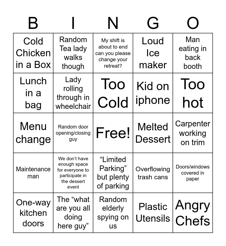 This bingo card has a free space and 24 words: We don’t have enough space for everyone to participate in the dessert event, The “what are you all doing here guy”, Too Cold, One-way kitchen doors, Man eating in back booth, Cold Chicken in a Box, Lunch in a bag, Random Tea lady walks though, Melted Dessert, “Limited Parking” but plenty of parking, Kid on iphone, Menu change, Overflowing trash cans, Doors/windows covered in paper, Lady rolling through in wheelchair, Plastic Utensils, Carpenter working on trim, My shift is about to end can you please change your retreat?, Too hot, Random door opening/closing guy, Angry Chefs, Maintenance man, Loud Ice maker and Random elderly spying on us.