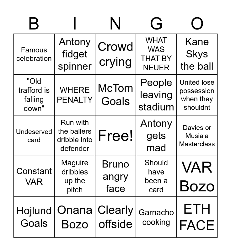 This bingo card has a free space and 24 words: Maguire dribbles up the pitch, Onana Bozo, McTom Goals, Hojlund Goals, Kane Skys the ball, Famous celebration, "Old trafford is falling down", Antony fidget spinner, Antony gets mad, Bruno angry face, People leaving stadium, Undeserved card, Should have been a card, VAR Bozo, WHERE PENALTY, Garnacho cooking, Davies or Musiala Masterclass, Crowd crying, United lose possession when they shouldnt, Run with the ballers dribble into defender, ETH FACE, Constant VAR, WHAT WAS THAT BY NEUER and Clearly offside.