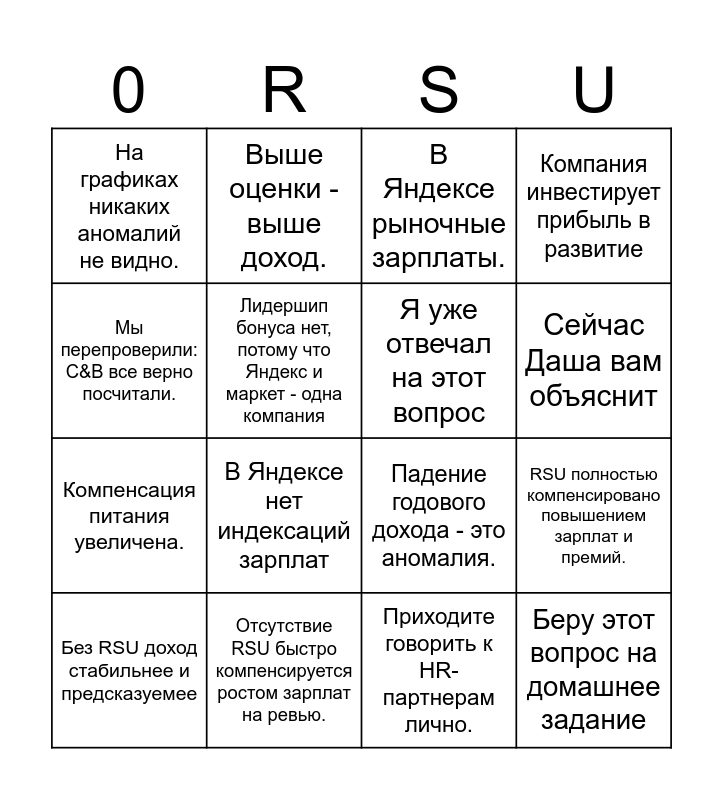 This bingo card has 16 words: Отсутствие RSU быстро компенсируется ростом зарплат на ревью., RSU полностью компенсировано повышением зарплат и премий., В Яндексе рыночные зарплаты., На графиках никаких аномалий не видно., Компенсация питания увеличена., Выше оценки - выше доход., Падение годового дохода - это аномалия., Приходите говорить к HR-партнерам лично., Мы перепроверили: C&B все верно посчитали., Лидершип бонуса нет, потому что Яндекс и маркет - одна компания, Без RSU доход стабильнее и предсказуемее, Компания инвестирует прибыль в развитие, В Яндексе нет индексаций зарплат, Сейчас Даша вам объяснит, Я уже отвечал на этот вопрос and Беру этот вопрос на домашнее задание.