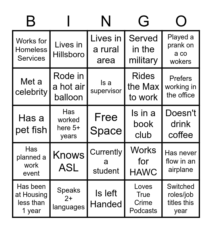 This bingo card has a free space and 24 words: Knows ASL, Speaks 2+ languages, Is a supervisor, Has been at Housing less than 1 year, Played a prank on a co wokers, Works for Homeless Services, Met a celebrity, Lives in Hillsboro, Is in a book club, Currently a student, Rides the Max to work, Has a pet fish, Works for HAWC, Has never flow in an airplane, Rode in a hot air balloon, Loves True Crime Podcasts, Doesn't drink coffee, Lives in a rural area, Prefers working in the office, Has worked here 5+ years, Switched roles/job titles this year, Has planned a work event, Served in the military and Is left Handed.
