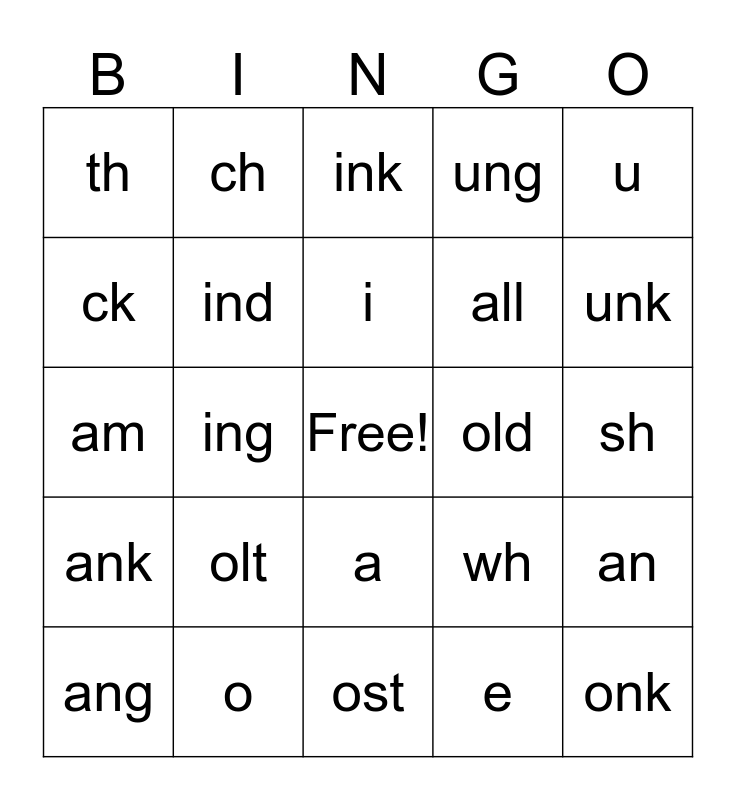 This bingo card has a free space and 26 words: a, e, i, o, u, th, ck, ch, sh, wh, all, am, an, ang, ing, ong, ung, ank, ink, onk, unk, ost, old, olt, ind and ild.