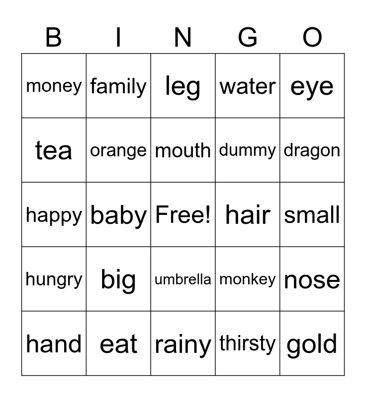 This bingo card has a free space and 61 words: sit, eat, sleep, hungry, thirsty, rice, orange, fruits, dummy, come in, water, coffee, tea, apple, soda, money, gold, eye, ear, mouth, hair, leg, hand, nose, ragbbit, tiger, dog, mouse/rat, dragon, snake, horse, sheep, chicken, pig, family, brother, sister, baby, angry, happy, sad, big, small, cow, monkey, hot, cold, shoe, coat, umbrella, rainy, snowy, sunny, windy, mahjong, cards, tv, puzzle, computer, knit and jewelry.