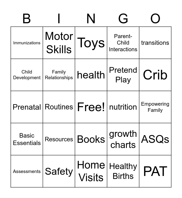This bingo card has a free space and 50 words: Curriculum, PAT, Parents, Home Visits, Resources, Connections, Motor Skills, Community Partners, Child Development, Parent Educator, Family Relationships, Parent-Child Interactions, ASQs, growth charts, dental care, discipline, health, nutrition, sleep, transitions, Routines, Healthy Births, Immunizations, Pretend Play, Activities, Self-Care, Crib, Formula, Toys, Books, Games, Pampers, SEEDS, Mercy's Closet, Safety, Attachment, Germs, Family Bonding, Mental Health, Empowering Family, Security, Goals, EmbraceGrace, Fire Safety, Assessments, Prenatal, Child Development, Family Well-Being, Basic Essentials and Personal Visits.