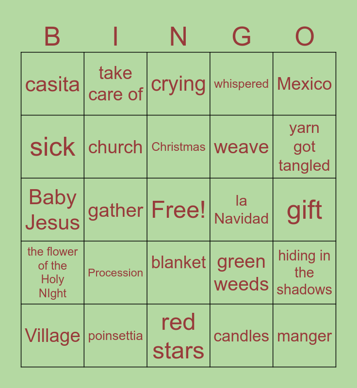 This bingo card has a free space and 24 words: Procession, poinsettia, Christmas, Village, Mexico, casita, sick, take care of, la Navidad, blanket, weave, Baby Jesus, green weeds, hiding in the shadows, church, candles, gift, crying, yarn got tangled, gather, manger, the flower of the Holy NIght, whispered and red stars.