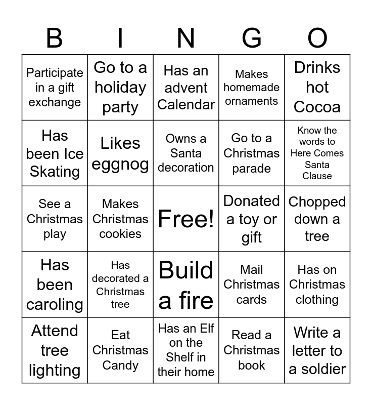 This bingo card has a free space and 37 words: Watched a Christmas movie, Ate Christmas cookies, Wrapped presents, Likes eggnog, Has on Christmas clothing, Has decorated a Christmas tree, Owns a Santa decoration, Has lights on their house, Drinks hot Cocoa, Picture with Santa, Makes Christmas cookies, Makes homemade ornaments, Write a letter to a soldier, Chopped down a tree, Has been Ice Skating, Has been caroling, Has Christmas Pajamas, Has an advent Calendar, Build a fire, Donated a toy or gift, Participate in a gift exchange, Know the words to Here Comes Santa Clause, Attend tree lighting, Has an Elf on the Shelf in their home, Have hung their stockings, Read a Christmas book, Go to a holiday party, Built a ginger bread house, Drive around and look at lights, Made a Christmas list, Bought yourself a Christmas gift, Eat Christmas Candy, See a Christmas play, Listen to Christmas Music, Mail Christmas cards, Go to a Christmas parade and Has a Christmas village decoration.