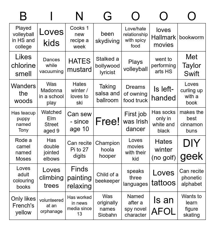This bingo card has a free space and 48 words: speaks three languages, went to performing arts HS, Was originally names Siobahn, Watched Elm Street aged 9, Hates winter / loves to ski, makes the best cinnamon buns, Loves kids, volunteered at an orphanage, loves Hallmark movies, Champion hoola hooper, bookworm, been skydiving, Is left-handed, Dreams of owning food truck, Loves adult colouring books, Has socks only in white and black, Likes chlorine smell, Met Taylor Swift, Loves tattoos, Love/hate relationship with spicy food, Plays volleyball, Can sew - since age 10, Played volleyball in HS and college, Dances while vacuuming, Can recite phonetic alphabet, HATES mustard, Loves curling up with a book, Only likes French's yellow, Taking salsa and ballroom, Was Madonna in a school play, Is an AFOL, First job was Irish dancer, DIY geek, Loves climbing trees, Has teacup puppy named Tony, Loves movies with their kid, Hates winter (no golf), Wanders the woods, Can recite Pi to 27 digits, Finds painting relaxing, Rode a camel named Moses, Wants to learn figure skating, Cooks 1 new recipe a week, Has worked in news media since 13, Stalked a bollywood lyricist, Child of a beekeeper, Has double jointed elbows and Named after a spy novel character.