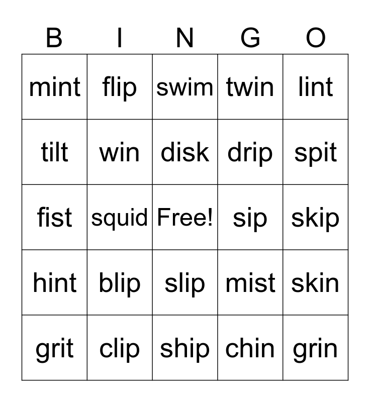 This bingo card has a free space and 24 words: blip, clip, disk, grit, lint, mint, tilt, flip, sip, slip, drip, fist, mist, skin, win, chin, skip, swim, spit, squid, grin, hint, twin and ship.