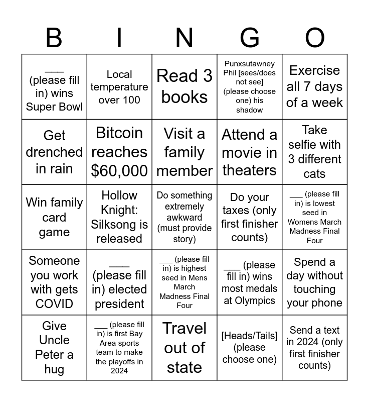 This bingo card has 25 words: ___ (please fill in) elected president, Travel out of state, Visit a family member, Give Uncle Peter a hug, Exercise all 7 days of a week, ___ (please fill in) wins Super Bowl, Get drenched in rain, Local temperature over 100, Do your taxes (only first finisher counts), ___ (please fill in) is highest seed in Mens March Madness Final Four, Attend a movie in theaters, Win family card game, ___ (please fill in) wins most medals at Olympics, Spend a day without touching your phone, Bitcoin reaches $60,000, Send a text in 2024 (only first finisher counts), ___ (please fill in) is lowest seed in Womens March Madness Final Four, Read 3 books, Take selfie with 3 different cats, Hollow Knight: Silksong is released, Do something extremely awkward (must provide story), ___ (please fill in) is first Bay Area sports team to make the playoffs in 2024, Someone you work with gets COVID, Punxsutawney Phil [sees/does not see] (please choose one) his shadow and [Heads/Tails] (please choose one).