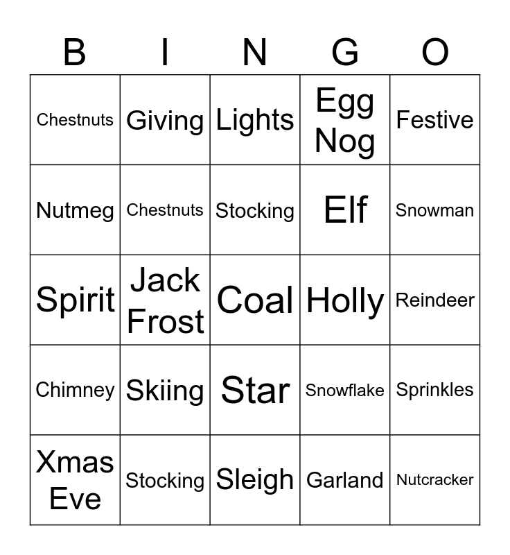 This bingo card has a free space and 200 words: Jingle, Candy cane, Merry, Bell, Tinsel, Santa, Tree, Reindeer, Snow, Elf, Lights, Nutmeg, Nutcracker, Presents, Star, Sleigh, Hot cocoa, Fire, Gingerbread, Chestnuts, Giving, Carolers, Peppermint, Jolly, Stocking, Ornaments, Holly, Mistletoe, Snowflake, Mrs. Clause, Rudolf, Xmas Eve, Christmas, Jack Frost, Snow globe, Skiing, Sledding, Snowboarding, Snowman, Festive, Egg Nog, Spirit, Chimney, Family, Garland, Sprinkles, Cookies, Advent calendar, Angel, wreath, Festive, Egg Nog, Spirit, Chimney, Family, Garland, Sprinkles, Cookies, Advent calendar, Angel, wreath, Jingle, Candy cane, Merry, Bell, Tinsel, Santa, Tree, Reindeer, Snow, Elf, Lights, Nutmeg, Nutcracker, Presents, Star, Sleigh, Hot cocoa, Fire, Gingerbread, Chestnuts, Giving, Carolers, Peppermint, Jolly, Stocking, Ornaments, Holly, Mistletoe, Snowflake, Mrs. Clause, Rudolf, Xmas Eve, Christmas, Jack Frost, Snow globe, Skiing, Sledding, Snowboarding, Snowman, Merry, Bell, Tinsel, Santa, Tree, Reindeer, Snow, Elf, Lights, Nutmeg, Nutcracker, Presents, Star, Sleigh, Hot cocoa, Fire, Gingerbread, Chestnuts, Giving, Carolers, Peppermint, Jolly, Stocking, Ornaments, Holly, Mistletoe, Snowflake, Mrs. Clause, Rudolf, Xmas Eve, Christmas, Jack Frost, Snow globe, Skiing, Sledding, Snowboarding, Snowman, Festive, Egg Nog, Spirit, Chimney, Family, Garland, Sprinkles, Cookies, Advent calendar, Angel, wreath, Jingle, Candy cane, Festive, Egg Nog, Spirit, Chimney, Family, Garland, Sprinkles, Cookies, Advent calendar, Angel, wreath, Jingle, Candy cane, Merry, Bell, Tinsel, Santa, Tree, Reindeer, Snow, Elf, Lights, Snowflake, Mrs. Clause, Rudolf, Xmas Eve, Christmas, Jack Frost, Snow globe, Skiing, Sledding, Snowboarding, Snowman, Nutmeg, Nutcracker, Presents, Star, Sleigh, Hot cocoa, Fire, Gingerbread, Chestnuts, Giving, Carolers, Peppermint, Jolly, Stocking, Ornaments, Holly and Mistletoe.