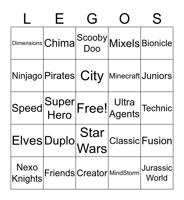 This bingo card has a free space and 24 words: Duplo, Friends, City, Nexo Knights, Bionicle, Dimensions, Ninjago, Chima, Ultra Agents, Star Wars, Minecraft, Speed, Classic, Fusion, Pirates, MindStorm, Technic, Scooby Doo, Juniors, Super Hero, Jurassic World, Elves, Mixels and Creator.