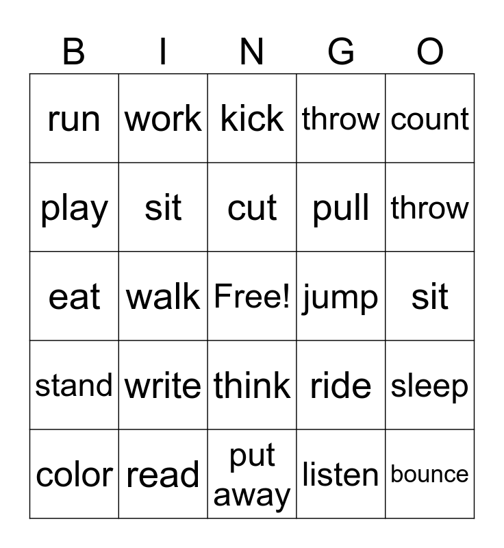 This bingo card has a free space and 24 words: write, read, cut, color, count, run, play, work, jump, think, pull, eat, ride, sleep, sit, listen, sit, kick, throw, walk, bounce, stand, throw and put away.