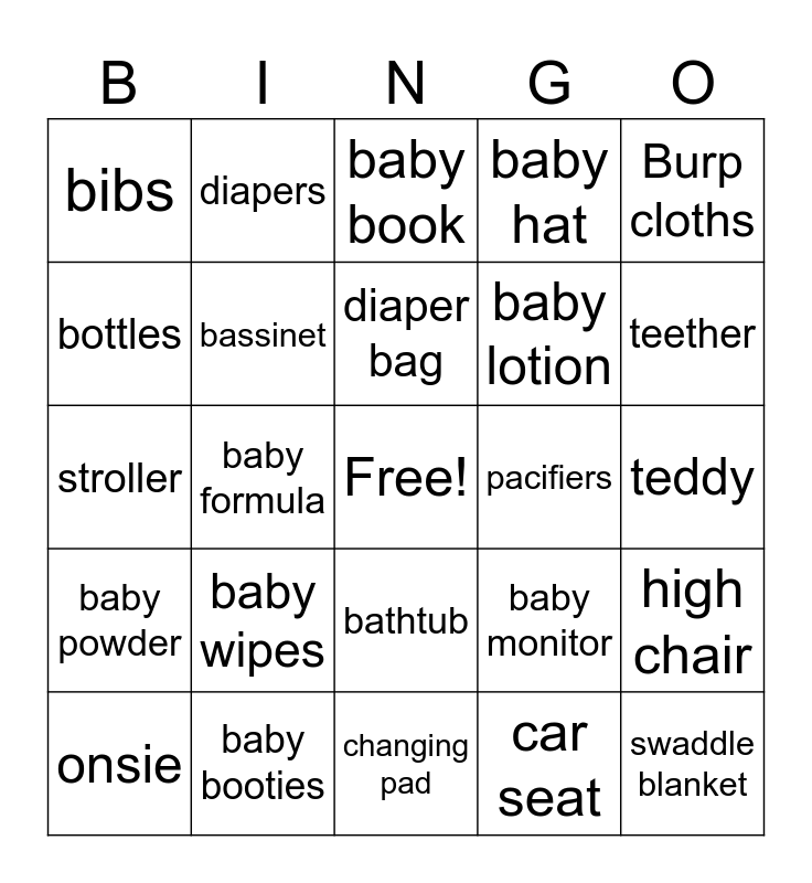 This bingo card has a free space and 25 words: baby wipes, changing pad, diaper bag, onsie, Burp cloths, bibs, bottles, diapers, pacifiers, bathtub, baby lotion, stroller, baby monitor, high chair, bassinet, swing, teddy, baby book, teether, baby formula, swaddle blanket, baby booties, baby powder, baby hat and car seat.