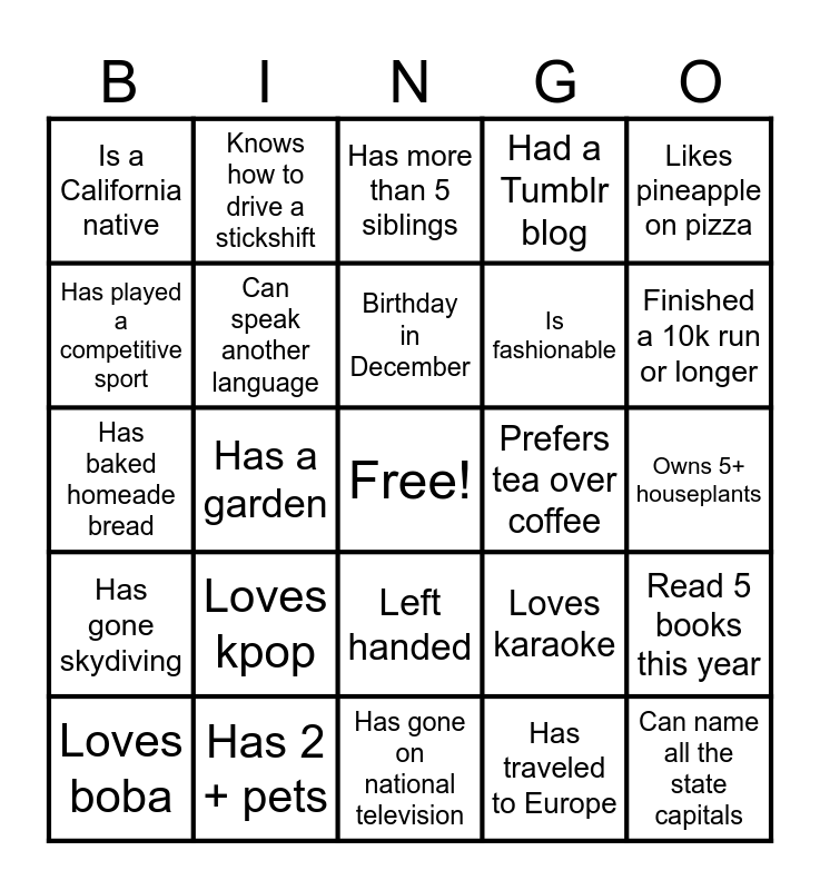 This bingo card has a free space and 42 words: Has a twin, Birthday in December, Favorite color is green, Loves kpop, Has traveled to Europe, Read 5 books this year, Can name all the state capitals, Never broke a bone, Has more than 5 siblings, Left handed, Owns 5+ houseplants, Finished a 10k run or longer, Has a garden, Likes pineapple on pizza, Can do a cartwheel, Loves karaoke, Visited 5+ national parks, Has baked homeade bread, Has a food allergy, Knows how to drive a stickshift, Has played a competitive sport, Is a Bay Area native, Is a Stockton native, Is a California native, Plays an instrument, Loves to dance, Is fashionable, Enjoys Sci-fi movies, Prefers cooking over baking, Listens to podcasts, Birthday on a holiday, Has gone skydiving, Can speak another language, Has gone on national television, Can juggle 3+ items, Loves boba, Has 2 + pets, Prefers tea over coffee, Likes to crochet, Drives a motorcycle, Had a Tumblr blog and Used Myspace.
