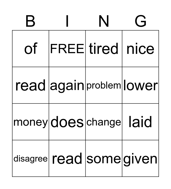 This bingo card has a free space and 15 words: disagree, given, tired, of, lower, read, does, some, again, money, laid, nice, problem, FREE and read.