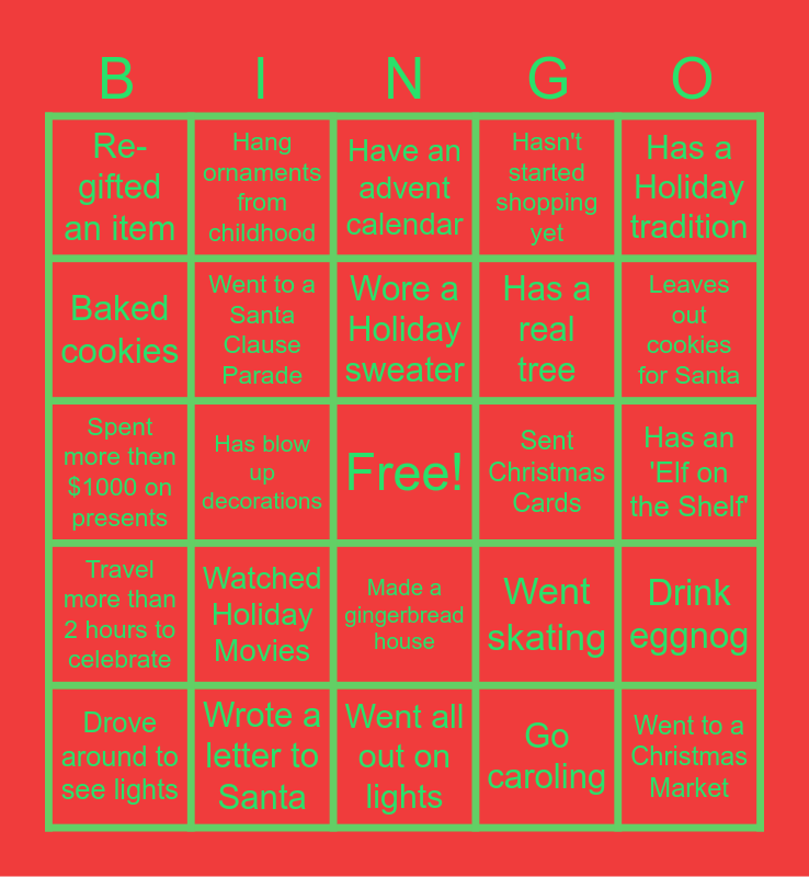 This bingo card has a free space and 25 words: Travel more than 2 hours to celebrate, Wrote a letter to Santa, Went all out on lights, Go caroling, Has a Holiday tradition, Re-gifted an item, Hang ornaments from childhood, Have an advent calendar, Sent Christmas Cards, Drink eggnog, Baked cookies, Went to a Santa Clause Parade, Has Holiday Pajamas, Went skating, Leaves out cookies for Santa, Drove around to see lights, Has blow up decorations, Wore a Holiday sweater, Has a real tree, Has an 'Elf on the Shelf', Spent more then $1000 on presents, Watched Holiday Movies, Made a gingerbread house, Hasn't started shopping yet and Went to a Christmas Market.