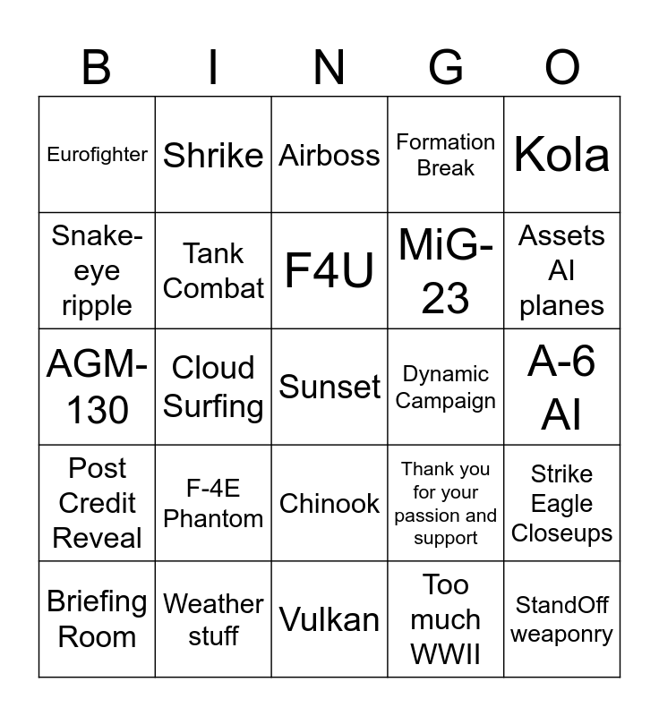This bingo card has 25 words: F-4E Phantom, Vulkan, F4U, Briefing Room, Kola, Eurofighter, Snake-eye ripple, Shrike, Dynamic Campaign, Chinook, MiG-23, AGM-130, Thank you for your passion and support, Strike Eagle Closeups, Tank Combat, StandOff weaponry, A-6 AI, Airboss, Assets AI planes, Cloud Surfing, Sunset, Weather stuff, Post Credit Reveal, Formation Break and Too much WWII.