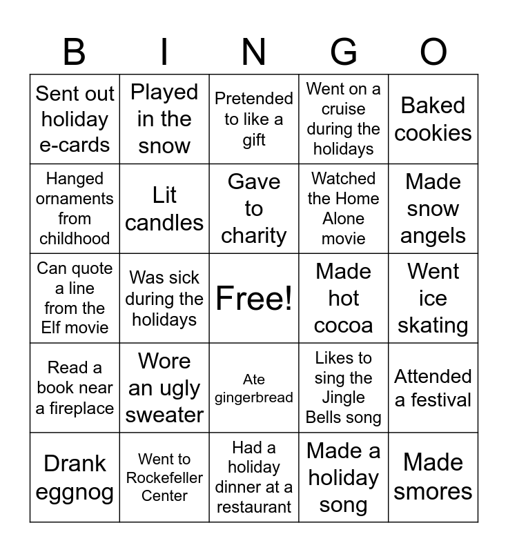 This bingo card has a free space and 24 words: Wore an ugly sweater, Went to Rockefeller Center, Gave to charity, Drank eggnog, Baked cookies, Sent out holiday e-cards, Hanged ornaments from childhood, Played in the snow, Made hot cocoa, Ate gingerbread, Watched the Home Alone movie, Can quote a line from the Elf movie, Likes to sing the Jingle Bells song, Attended a festival, Lit candles, Made a holiday song, Went ice skating, Pretended to like a gift, Made snow angels, Was sick during the holidays, Made smores, Read a book near a fireplace, Went on a cruise during the holidays and Had a holiday dinner at a restaurant.