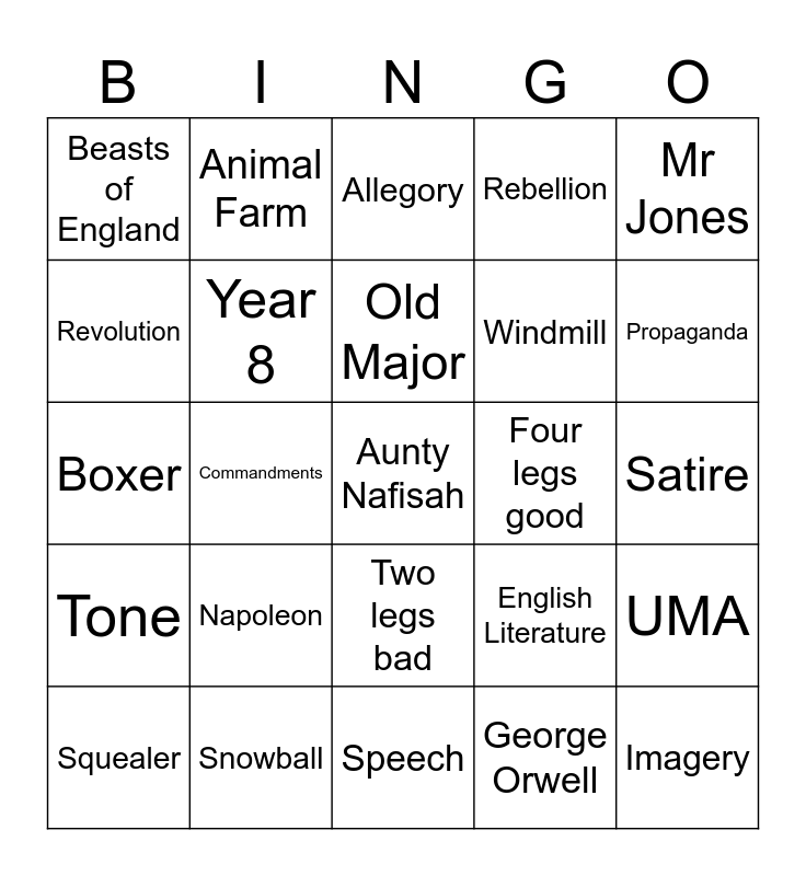 This bingo card has a free space and 24 words: Napoleon, Snowball, Old Major, Squealer, Mr Jones, Beasts of England, Revolution, Animal Farm, Four legs good, Two legs bad, Windmill, Boxer, English Literature, UMA, Year 8, George Orwell, Satire, Allegory, Propaganda, Commandments, Imagery, Tone, Rebellion and Speech.