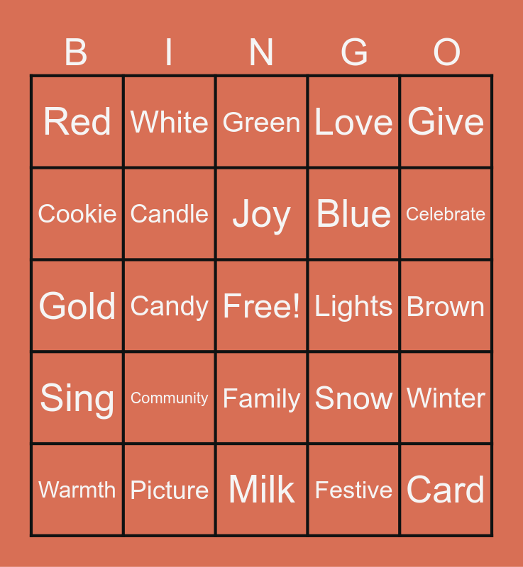 This bingo card has a free space and 24 words: Warmth, Community, Joy, Festive, Give, Red, White, Green, Lights, Brown, Gold, Candle, Snow, Winter, Cookie, Picture, Milk, Love, Celebrate, Sing, Candy, Family, Blue and Card.