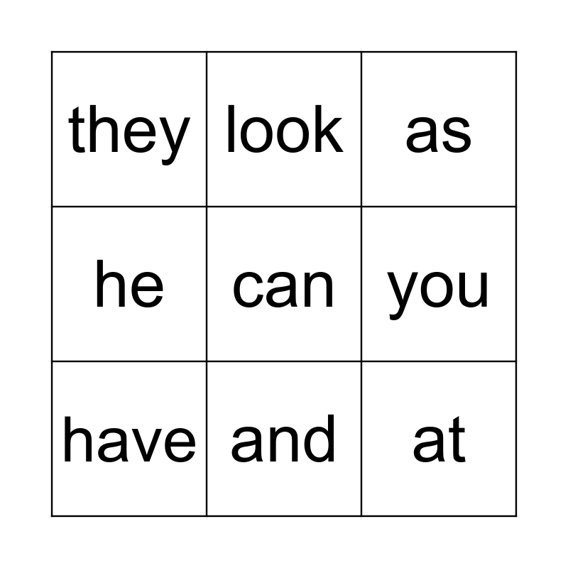 This bingo card has 12 words: on, at, can, you, look, as, and, in, they, he, have and am.