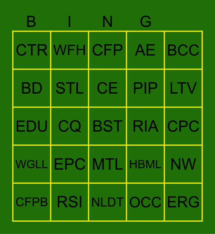 This bingo card has 58 words: Free!, RSI, CCTS, WGLL, OCC, STT, STL, RAPID, PIP, LAE, AE, AAE, MNI, HQ, mPV, CTR, BST, BCC, AIR, CE, RIA, CFP, CFPB, NW, CMS, CPC, CPF, VMM, LTV, SMB, RU, HRBP, REWS, ROAS, SEM, SEO, SERP, CQ, EDU, EEAT, EPC, ERG, HBML, OKR, KPI, KW, mCPV, MTL, NLDT, NPS OG, PEDD, ROI, RR, TLDR, WFH, CWV, BD and CRM.