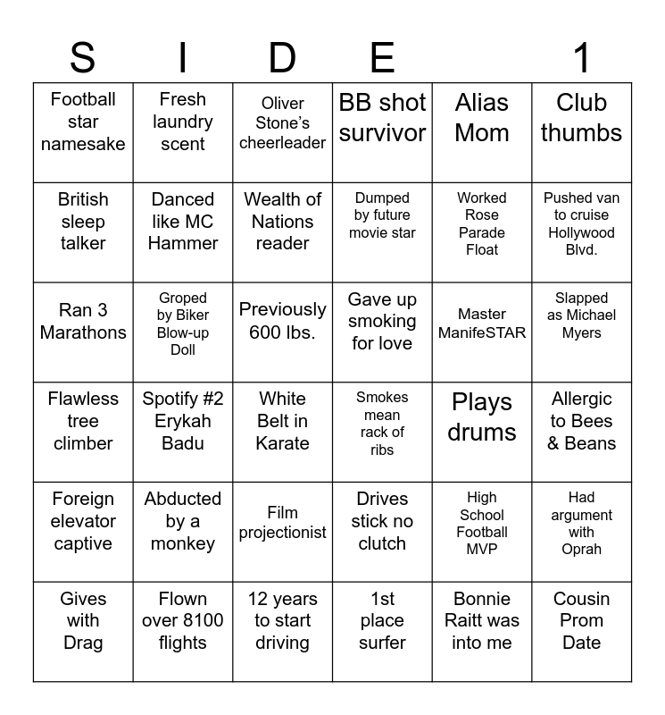 This bingo card has 54 words: Boxed with Courtney Love, Gave up smoking for love, Famous while traveling, Abducted by a monkey, Slapped as Michael Myers, Cousin Prom Date, BB shot survivor, Overall wet, Club thumbs, Upright Bass player, Football star namesake, 1st place surfer, Smokes mean rack of ribs, White Belt in Karate, More states in Mexico vs US, Plays drums, Ran 3 Marathons, Wealth of Nations reader, McD’s at $4.25/hr, Previously 600 lbs., Flawless tree climber, Film projectionist, Groped by Biker Blow-up Doll, Alias Mom, Pickle Hater, Fresh laundry scent, Gives with Drag, Buddhist in Mexico, Drives stick no clutch, Allergic to Bees & Beans, Michael Bublé rendezvous, 12 years to start driving, Cartoon voice, 1 month, 7 countries, Oliver Stone’s cheerleader, Bonnie Raitt was into me, Worked Rose Parade Float, Spotify #2 Erykah Badu, Foreign elevator captive, British sleep talker, Clown Fearing, Betties Club President, RV'd thru Iceland, HS dropout with PhD, Master ManifeSTAR, Two University Teacher, Flown over 8100 flights, High School Football MVP, Danced like MC Hammer, Pushed van to cruise Hollywood Blvd., Dumped by future movie star, Helped invent texting, Had argument with Oprah and Previous paid prisoner pen pal.