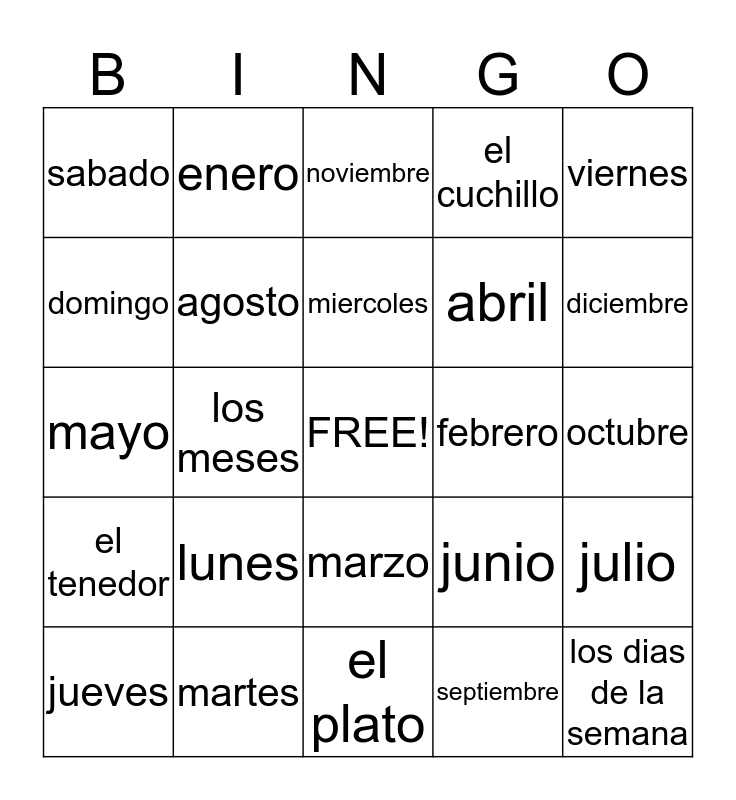 This bingo card has a free space and 24 words: lunes, martes, miercoles, jueves, viernes, sabado, domingo, enero, febrero, marzo, abril, mayo, junio, julio, agosto, septiembre, octubre, noviembre, diciembre, los meses, los dias de la semana, el tenedor, el cuchillo and el plato.