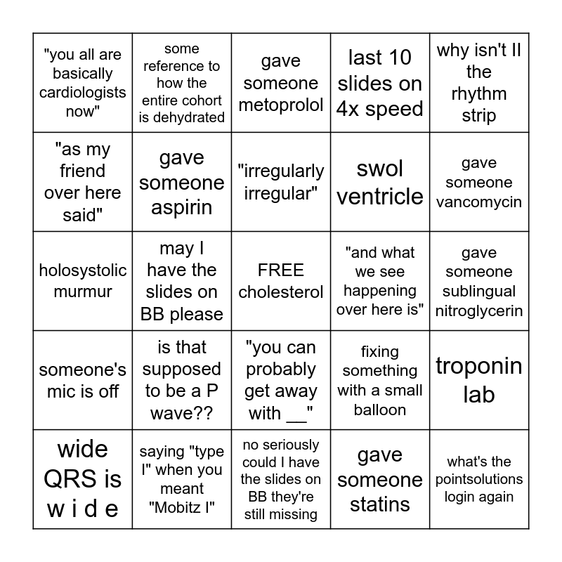 This bingo card has a free space and 24 words: is that supposed to be a P wave??, saying "type I" when you meant "Mobitz I", "irregularly irregular", wide QRS is w i d e, why isn't II the rhythm strip, "you all are basically cardiologists now", "as my friend over here said", some reference to how the entire cohort is dehydrated, "and what we see happening over here is", "you can probably get away with __", swol ventricle, holosystolic murmur, fixing something with a small balloon, troponin lab, gave someone aspirin, gave someone statins, gave someone sublingual nitroglycerin, gave someone metoprolol, gave someone vancomycin, may I have the slides on BB please, what's the pointsolutions login again, someone's mic is off, last 10 slides on 4x speed and no seriously could I have the slides on BB they're still missing.