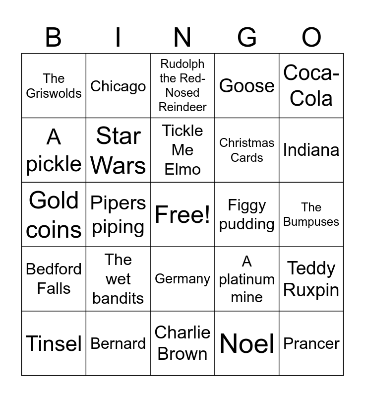 This bingo card has a free space and 55 words: An old silk hat, Tinsel, The Polar Express, The Griswolds, Charlie Brown, Clarice, Star Wars, He gets his tongue stuck to a flag pole, Christmas Cards, The Marines, Goose, Ebenezer, Hansel and Gretel, Claus marks, Eight, Mistletoe, Coca-Cola, Pipers piping, Deck the Halls, Prancer, Figgy pudding, Hawaiian, A platinum mine, Rudolph the Red-Nosed Reindeer, World War I, Tickle Me Elmo, Noel, French, The Bumpuses, Teddy Ruxpin, Hermey, Jingle Bells, Candy, candy canes, candy corns, and syrup, Thanksgiving, A pickle, Gold coins, 11 cookies, Bedford Falls, A librarian, Six, Chicago, A one-year membership to the Jelly of the Month Club, Be sure to drink your Ovaltine, A bar of soap in his mouth, The wet bandits, Bernard, An iPod, 40, A tarantula, Indiana, Japan, White Christmas, 15 years, Germany and The Statue of Liberty.