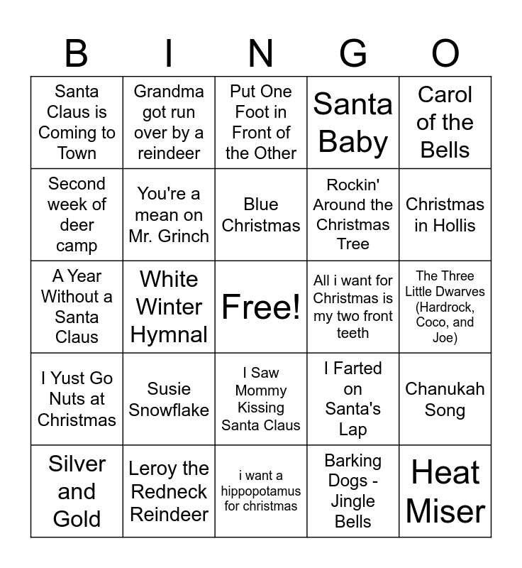 This bingo card has a free space and 46 words: Cold Miser, Heat Miser, Santa Lost a Ho, i want a hippopotamus for christmas, Susie Snowflake, Christmastime is Here, Grandma got run over by a reindeer, Little Saint Nick, Second week of deer camp, All I want for Christmas is you, You're a mean on Mr. Grinch, Santa Baby, Chanukah Song, I Farted on Santa's Lap, Grown up Christmas List, Dominick the Donkey, Blue Christmas, All i want for Christmas is my two front teeth, Jingle Bells Batman Smells, Carol of the Bells, White Winter Hymnal, Barking Dogs - Jingle Bells, Santa Claus is Coming to Town, Rockin' Around the Christmas Tree, The Chipmunk Song (Christmas Don't Be Late), Christmas in Hollis, Silver and Gold, Keep Christmas With You, I Saw Mommy Kissing Santa Claus, I Yust Go Nuts at Christmas, Snoopy vs. The Red Baron, White Christmas, Christmas in Kilarney, (There's No Place Like) Home for the Holidays, Sleigh Ride, Leroy the Redneck Reindeer, The Three Little Dwarves (Hardrock, Coco, and Joe), Frosty The Snowman, Nine Little Reindeer, The Christmas Song, Even A Miracle Needs a Hand, Put One Foot in Front of the Other, A Year Without a Santa Claus, It's Gonna Snow, The Christmas Waltz and Snow.